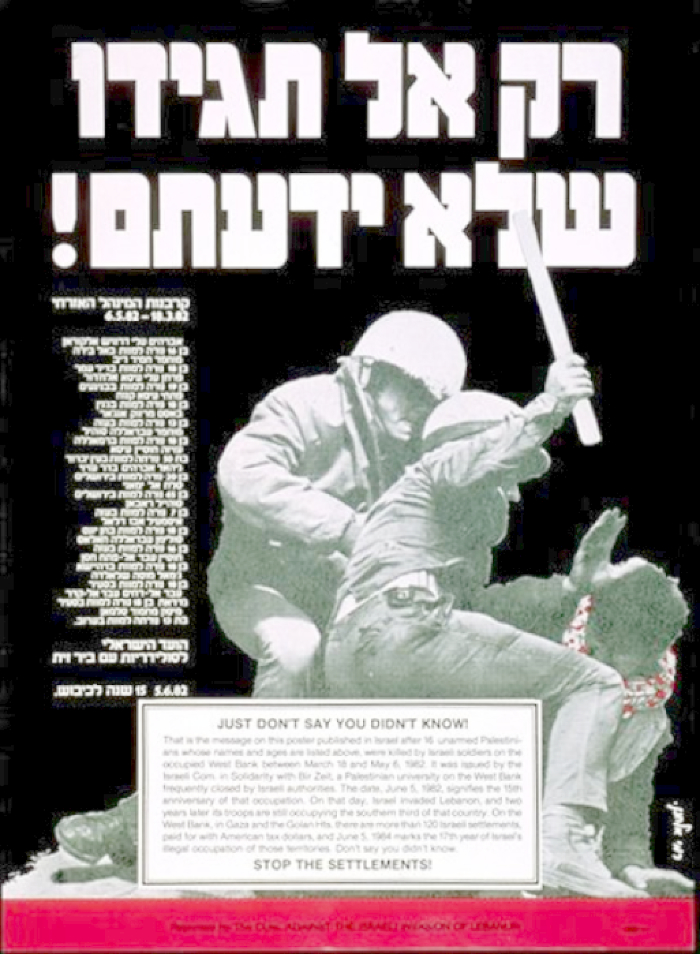 Just Don't Say You Didn't Know! Stop the Settlements! (reprint of poster published in Israel listing 16 unarmed Palestinians killed by Israeli soldiers between March 18 and May 6, 1982)